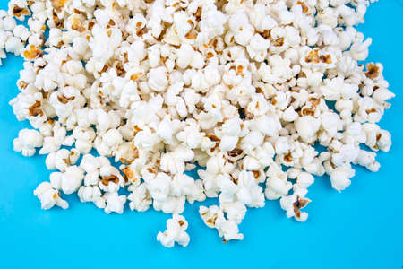 Delicious popcorn pile: A savory snack against a vibrant, teal backdrop