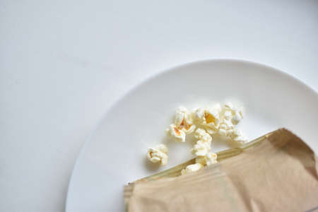 Fresh popcorn in bag made in a microwave on grey kitchen table