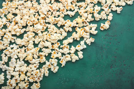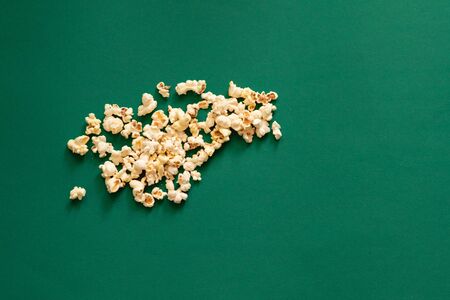Delicious freshly popped popcorn scattered across a vibrant green surface with soft shadows