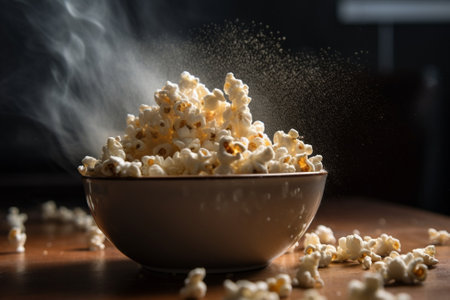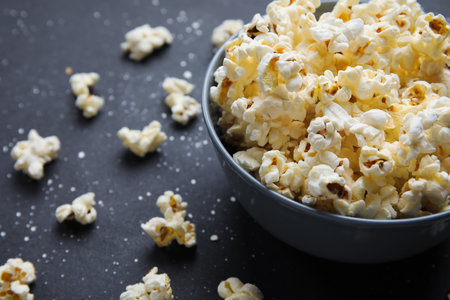 Bowl of freshly popped popcorn on a dark textured surface, perfect for movie night or snack time enjoyment