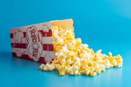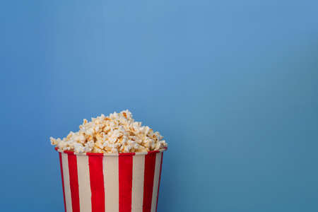 Buttter Popcorn in a Red and White Striped Container on a Blue Background