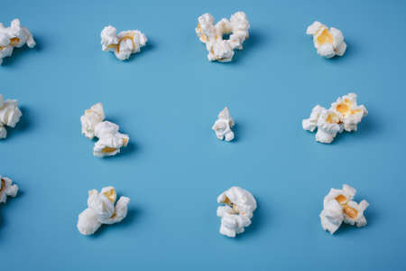 Heap of fried popcorn with cheese on a blue background, top view. copy space