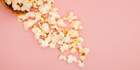 The image showcases a delectable close-up of a generous pile of freshly popped popcorn against a soft pink background. The popcorn texture is fluffy, light, buttery and ready to eat.