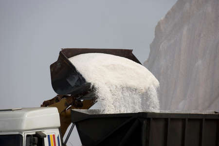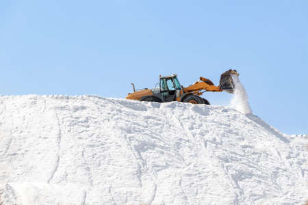 Excavator working in a huge pile salt at saltworks. Marine salt produced by the evaporation of seawater.