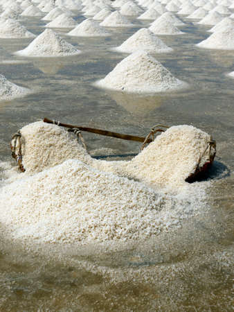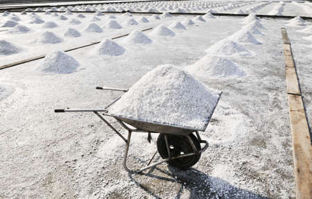 Dry salt in the dolly and row of salt pyramid-like ready to be collected