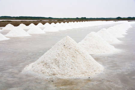 Heaps of salt in rows ready to be harvested in the salt fields of Kampot Province which shows the local culture and traditional livelihood of the Khmer people