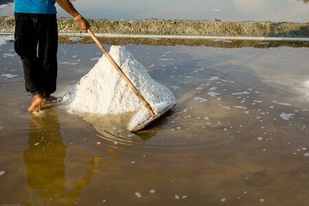 Salt pan and workers working on day time, salt pile in Thailand
