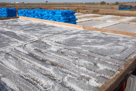 Sea salt farm at Samut Sakhon, Thailand. Organic sea salt. Evaporation and crystallization of sea water. Raw material of salt industrial. Sodium Chloride. Solar evaporation system. Iodine source.