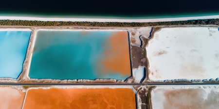 Generative AI, Salt farm landscape, photorealistic top view drone, horizontal banner. Extraction of salt from sea water