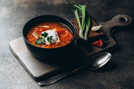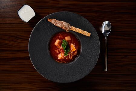 Traditional Russian and Ukrainian borsch, red soup with bread on a dark background. Borsch with meat, sour cream and dill. Overhead Copy Space