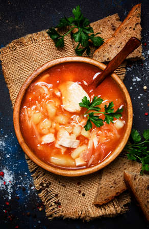 tasty red soup with pieces of fish in original bowl made from homemade brown bread on white plate with green pepper against dark wooden table