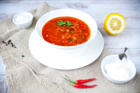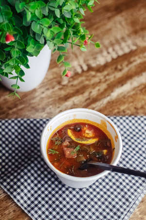 Russian traditional thick meat soup solyanka served on wooden table