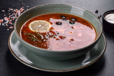 Traditional russian soup solyanka. Hodgepodge soup with meat, lemon and olives. Served with sour cream