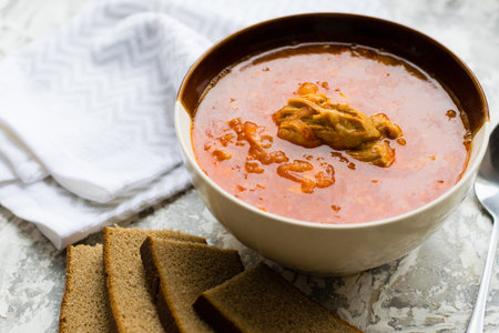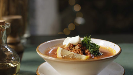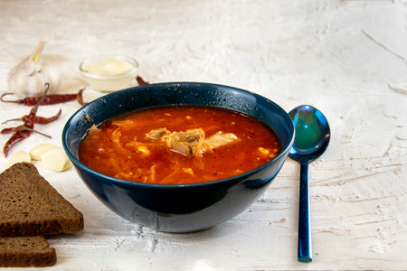 Solyanka - Russian traditional meat soup in bowl close up horizontal top view