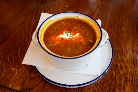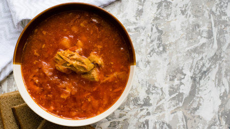 Delicious and aromatic red soup with meat, Ukrainian borscht. Traditional Ukrainian dish, cuisine.