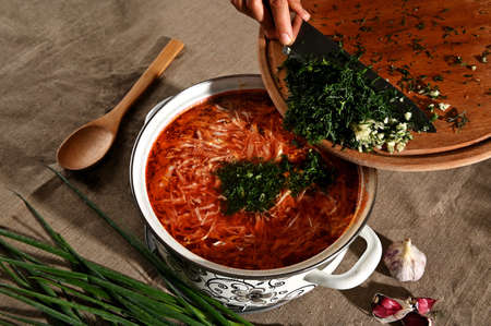 Top view of chef's hands fill freshly boiled borscht with chopped fresh dill, herbs and garlic. Food composition with pot of Ukrainian traditional soup, wooden spoon, green onions on linen tablecloth