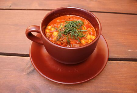 Traditional hodgepodge soup in a bowl on a wooden table. selective focus.