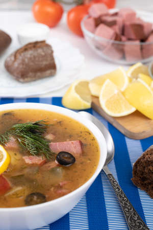 Traditional homemade Russian meat soup Solyanka with black olives and lemon