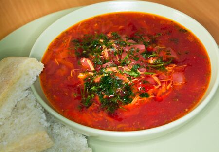 Traditional Ukrainian borscht, bowl of red beet root soup borsch