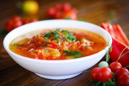 soup of sweet peppers and tomatoes in a plate on the table