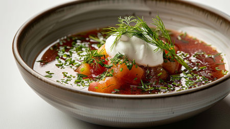 Authentic Russian cuisine close up of borscht with sour cream and dill on white background