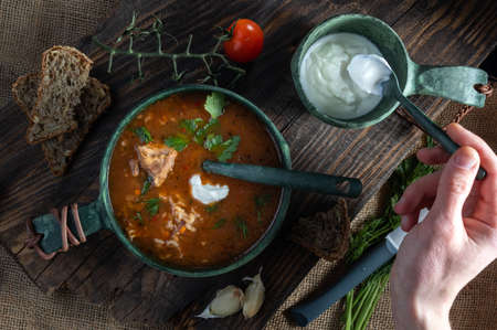 Close-up of the traditional Russian soup borscht made from cabbage, beets and other vegetables served in a clay ceramic plate with sour cream and garlic. National cuisine concept. Selective focus.
