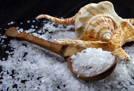 Large crystals of sea salt is poured from a seashell on the old wooden background, selective focus