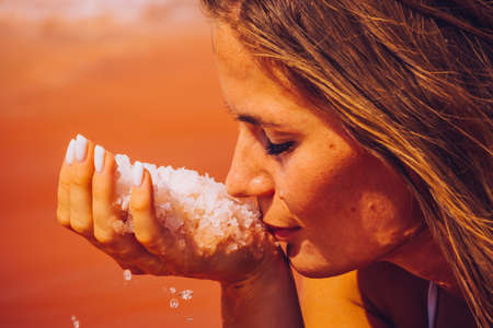 Young woman with long hair in pink salty lake with crystals of salt. Extremely salty pink lake, colored by microalgae with crystalline salt depositions. Spa, beauty and health care concept.