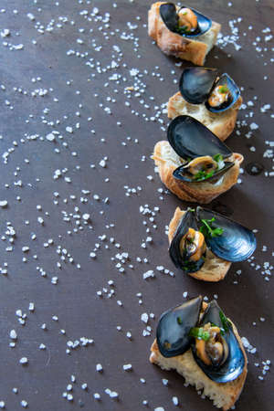 Cooked delicious black mussel with toasted bread. Healthy eating concept, rich protein food