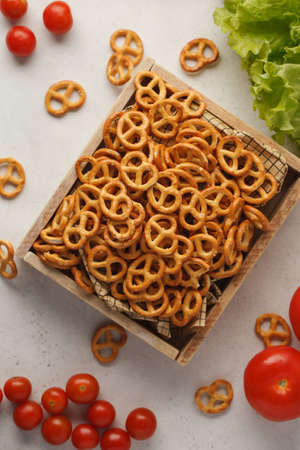 An overhead photo of salty crackers. Sticks and pretzels, shot from above on a white background with copy space. Party snacks banner with a place for text