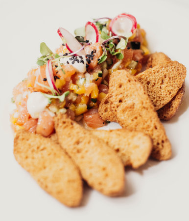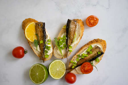 toasts with salmon, cottage cheese, avocado, microgreens on white background, open fish sandwiches, closeup