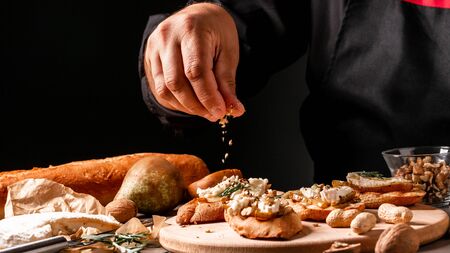 Appetizers table with italian antipasti snacks. Young man preparing appetizer while cooking in the kitchen. Long banner format. space for text.