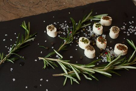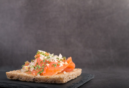 Smoked Salmon and soft chees canapes appetizers with chives on black table.
