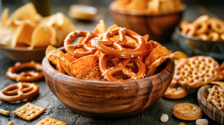 Salty snacks. Pretzels, chips, crackers in wooden bowls.