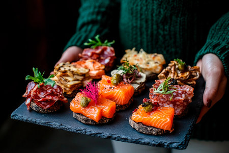 A person proudly presents a beautifully arranged platter of gourmet tapas featuring vibrant seafood and cured meats. The elegant display captivates with colorful garnishes, inviting anyone to indulge.
