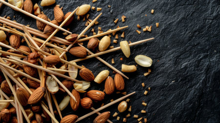 A close-up view of a collection of various nuts, such as almonds, peanuts, and cashews, placed next to wooden skewers on a sleek black surface. The nuts are scattered haphazardly, contrasting with the organized skewers, creating a visually interesting composition.