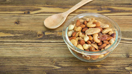 wooden bowl with mixed nuts. Healthy food and snack. Walnut, peanuts, almonds, hazelnut and cashews.