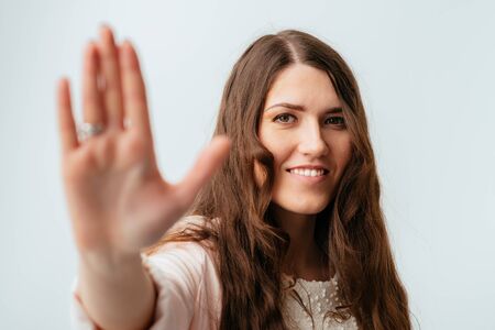 long-haired beautiful brunette girl showing stop isolated on white background