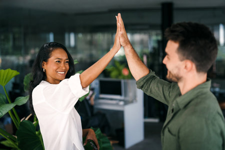 two cheerful businesspeople giving each other a high five inside of the office during the day.