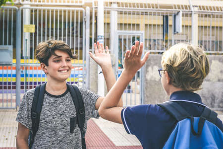 Two young students greet each other before the lessons. Happy boys with backpack meet out of institute after summer holidays the first day of school. Youth educational togetherness friendship concept.