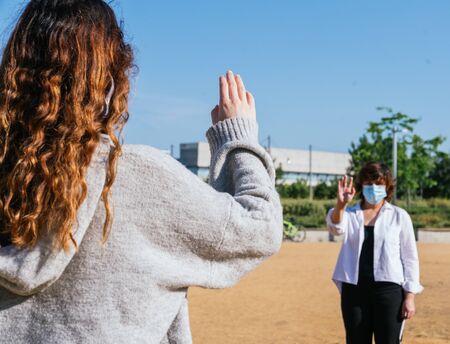 Social distance. Two neighbors walk through a park and greet each other while keeping their distance from the pandemic. Pandemic. Coronation virus devices. Coronavirus. Covid-19. Social distancing