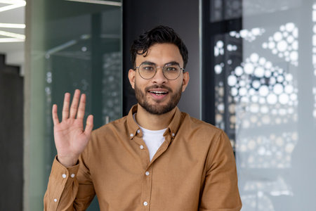 Young man waving hand and looking at camera during a video call in modern office. Professional communication, virtual meeting, and online conversation concept.