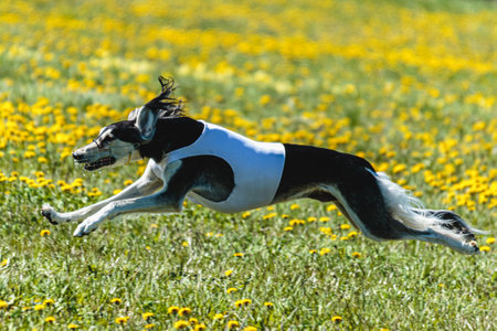 Borzoi dog in white shirt running and chasing lure in the field on coursing competition