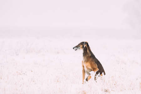 Hunting Sighthound Hortaya Borzaya Dog During Hare-hunting At Winter Day In Snowy Field