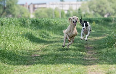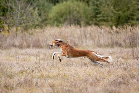 Coursing training. Saluki greyhound dog chasing bait in a field