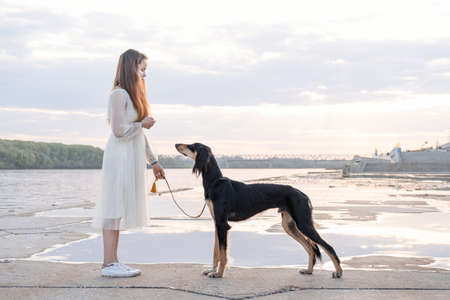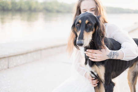 Saluki dog standing with attractive young woman near river bank. close up portrait.
