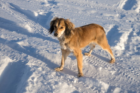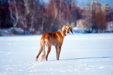 Red dog saluki portrait in winter field