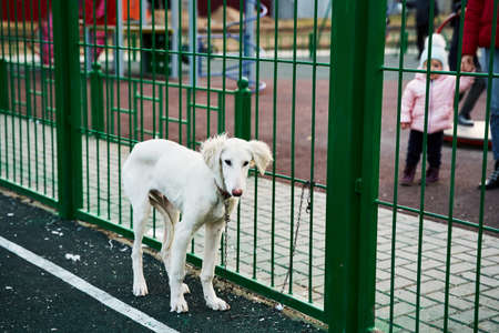 Lonely and sad white dog breed Russian hound stands on the street playground for mini football