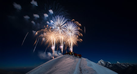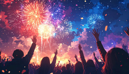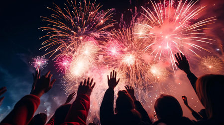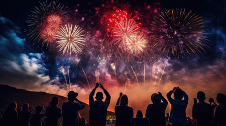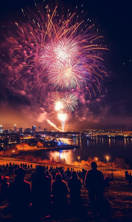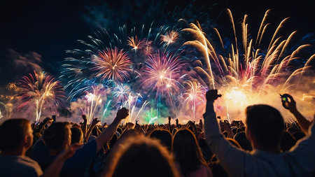 A captivating firework display illuminating the night sky during a cultural celebration, with spectators gathered to witness the spectacle, symbolizing joy and communal spirit.
