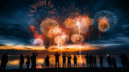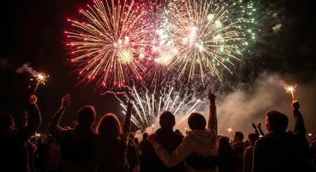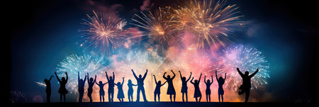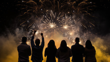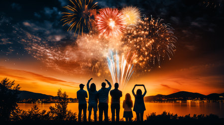 Silhouette of people watching fireworks, celebratory atmosphere,